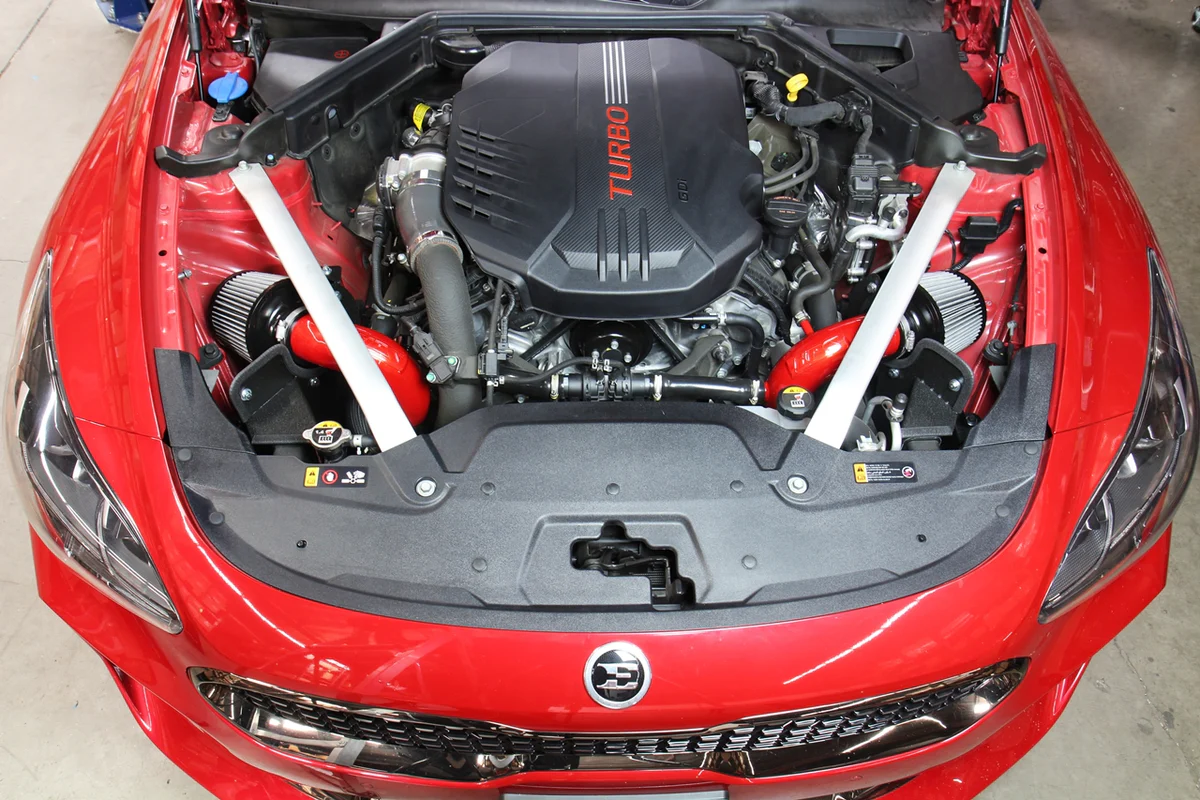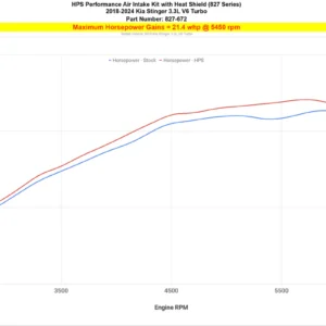 HPS Performance Red Air Intake Kit (Part Number 827-672R) for 2018-2024 Kia Stinger 3.3L V6 Twin Turbo offers a free-flowing 2-3/4 inch mandrel-bent aluminum tube induction system designed to produce dyno proven performance gains – increase horsepower +21.4 whp , torque +20.6 ft/lbs and improve throttle response while maintaining safe air fuel ratio. The heavy duty powder coated steel heat shield blocks hot air from the air filter for the best cooling effect. The included installation manual has clear pictures and instructions to guide the installer throughout the whole process. The kit does NOT require tuning and does not trigger CEL light. No modification is required during the installation. HPS light weight mandrel-bent aluminum alloy tube replaces the stock restrictive air box and optimizes the airflow with excellent heat dissipation and long lasting durability. HPS Performance 827 Series shortram cold air intake kit features race proven reinforced silicone hoses and industrial grade 100% stainless steel t-bolt clamps which ensures reliability, even during the most extreme driving conditions. Proudly made in the United States, the All-New HPS Performance Air Filter is designed with performance in mind, delivering excellent filtration without sacrificing airflow.